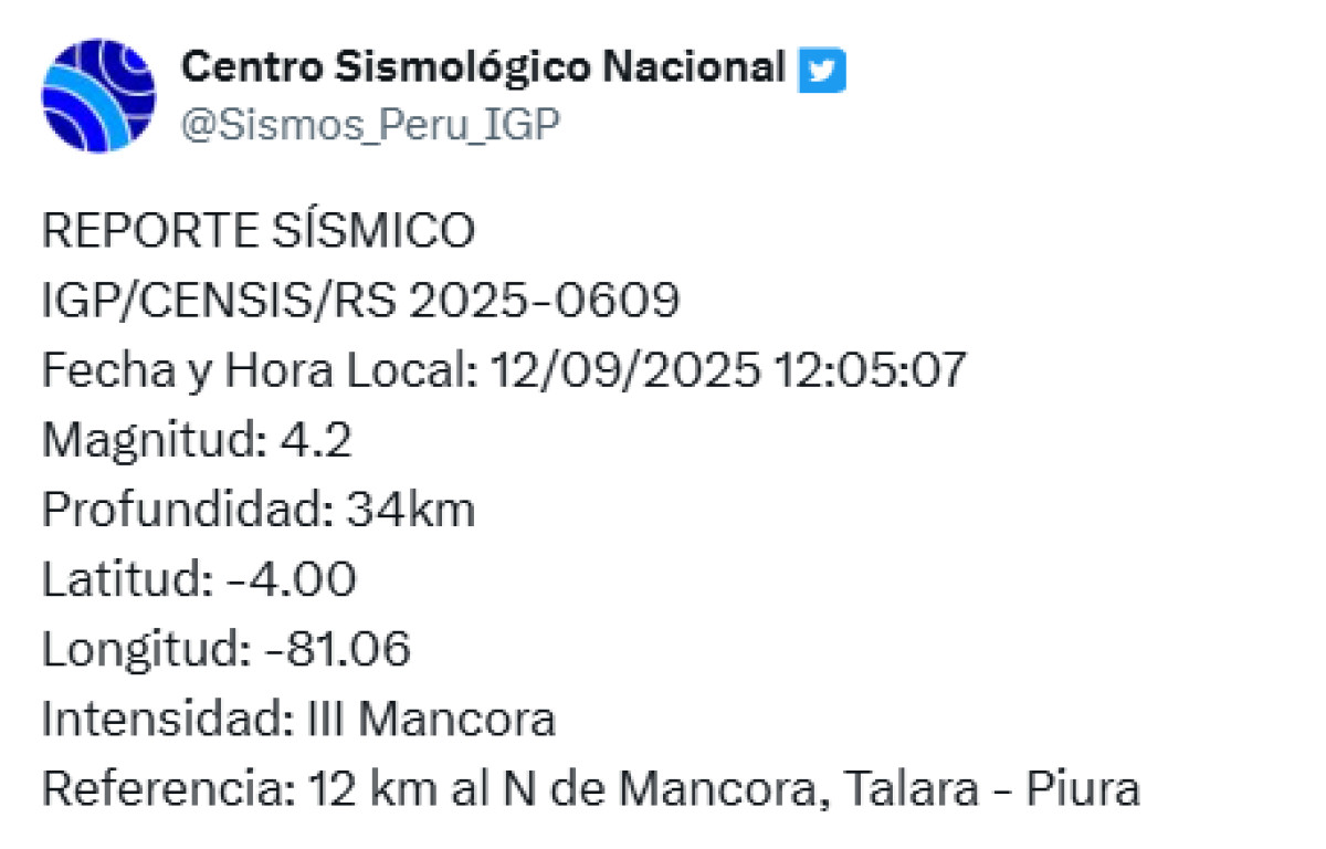 Un temblor de 4,2 grados se sintió a las 12:05 p. m. en Máncora, Talara, Piura según reportó el IGP. El temblor tuvo una profundidad de 34 km. y una referencia de 12 km. al norte de Talara.
