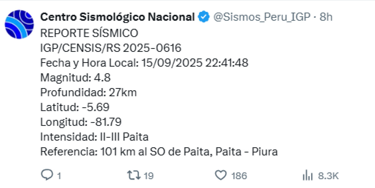 Un sismo de magnitud 4,8 sacudió la ciudad de Piura el último lunes 15 de septiembre a las 10:41 p.m. El movimiento telúrico se desarrolló a 101 km al suroeste de Paita.