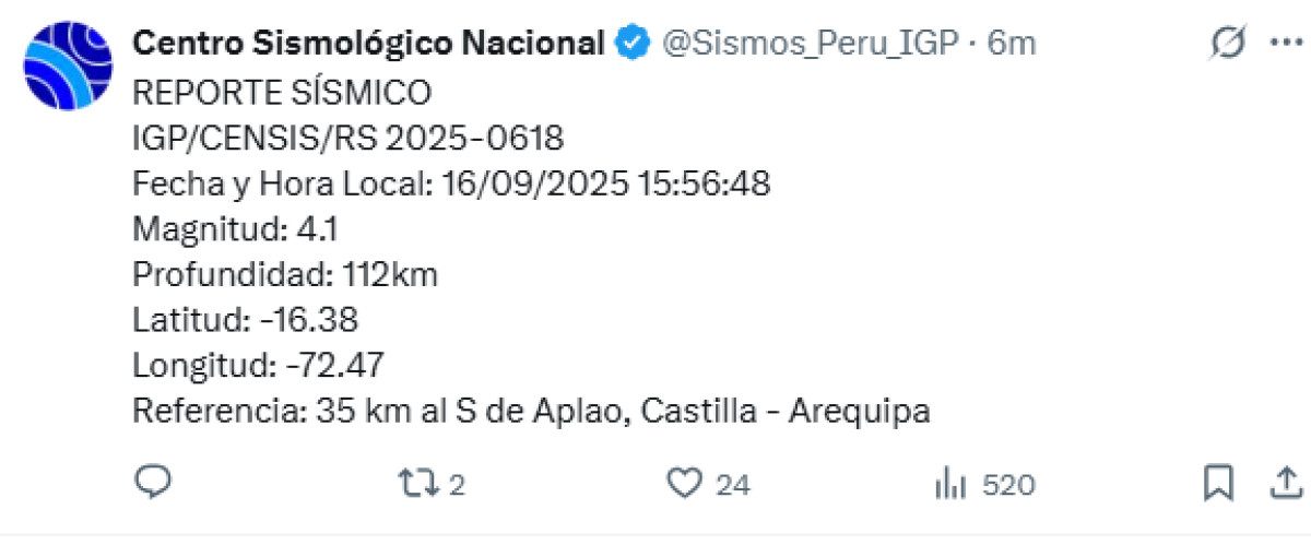 Un sismo de magnitud 4,1 sacudió la ciudad de Arequipa el último martes 16 de septiembre a las 3:56 p.m. El movimiento telúrico se desarrolló a 35 km al sur de Aplao, Castilla.