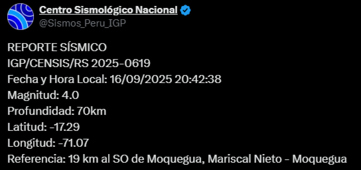 Un sismo de magnitud 4,0 sacudió la región de Arequipa el último martes 16 de septiembre a las 20:42 p.m. El movimiento telúrico se desarrolló a 19 km al suroeste de Moquegua, Mariscal Nieto.