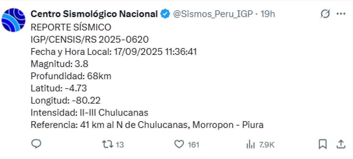 Un sismo de magnitud 3,8 se registró en la ciudad de Piura a las 11:36 a.m. del miércoles 17 de septiembre. El movimiento telúrico tuvo una profundidad de 68 km y se dio a 41 km al norte de Chulucanas.
