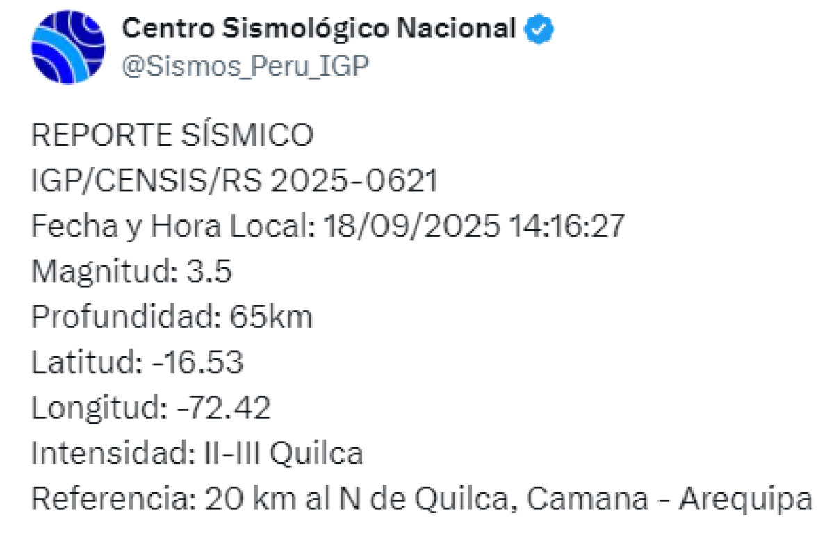 Un sismo de magnitud 3,65se registró a las 14:16 p. m. a 20 kilómetros al norte de Quilca, Camaná, Arequipa. El temblor del 18 de septiembre de 2025, se registró a una profundidad de 65 kilómetros, según informó el Instituto Geofísico del Perú (IGP) vía Twitter. Recuerda tener siempre lista una mochila de emergencia para estar preparado ante un desastre natural.
