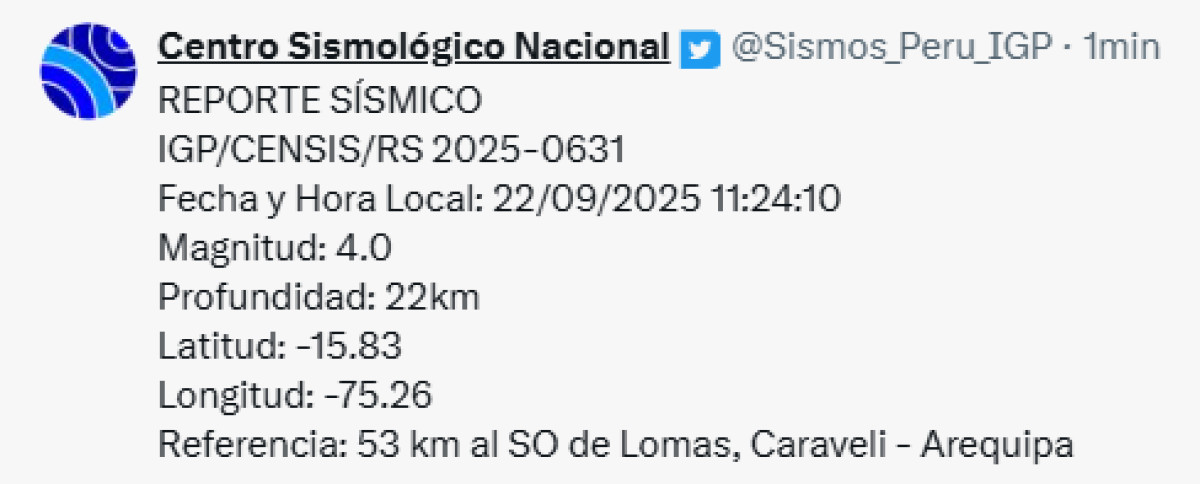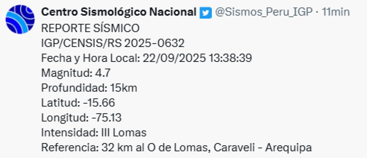 Un temblor de magnitud 4,0 se registró a las 11:24 a. m. a 53 kilómetros al suroeste de Lomas, Arequipa. El temblor del 22 de septiembre de 2025, se registró a una profundidad de 22 kilómetros, según informó el Instituto Geofísico del Perú (IGP) vía Twitter. Recuerda tener siempre lista una mochila de emergencia para estar preparado ante un desastre natural.