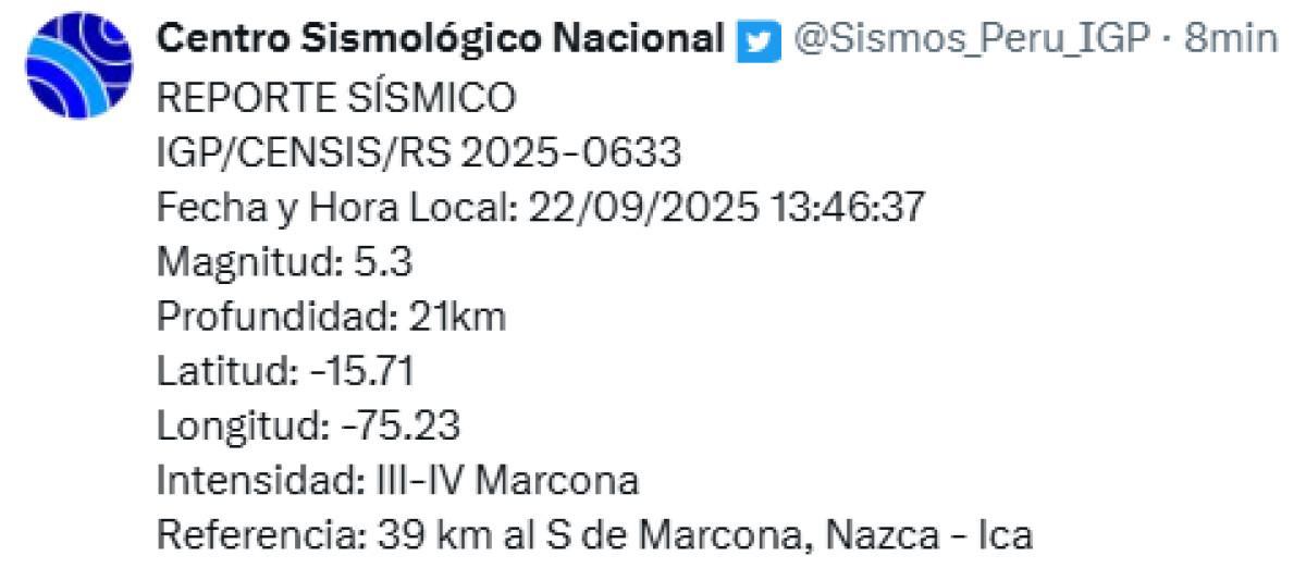Un temblor de magnitud 5,3 se registró a las 01:46 p. m. a 39 kilómetros al sur de Marcona, Naza, Ica. El temblor del 22 de septiembre de 2025, se registró a una profundidad de 39 kilómetros, según informó el Instituto Geofísico del Perú (IGP) vía Twitter. Recuerda tener siempre lista una mochila de emergencia para estar preparado ante un desastre natural.
