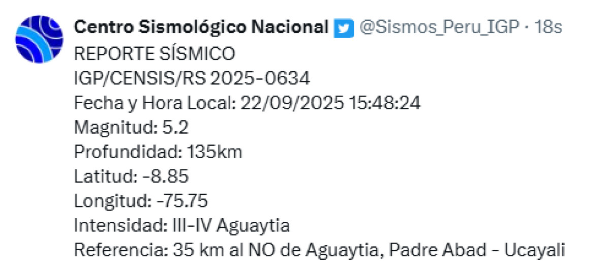 Un temblor de magnitud 5,2 se registró a las 01:46 p. m. a 39 kilómetros al noroseste de Aguaytía, Ucayali. El temblor del 22 de septiembre de 2025, se registró a una profundidad de 35 kilómetros, según informó el Instituto Geofísico del Perú (IGP) vía Twitter. Recuerda tener siempre lista una mochila de emergencia para estar preparado ante un desastre natural.