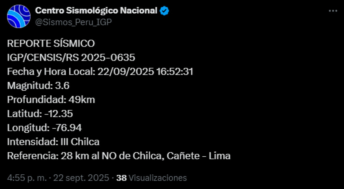 Un temblor de magnitud 3,6 se registró a las 4:52 p. m. a 28 kilómetros al noroseste de Chilca, Cañete en Lima. El temblor del 22 de septiembre de 2025, se registró a una profundidad de 49 kilómetros, según informó el Instituto Geofísico del Perú (IGP) vía Twitter. Recuerda tener siempre lista una mochila de emergencia para estar preparado ante un desastre natural.