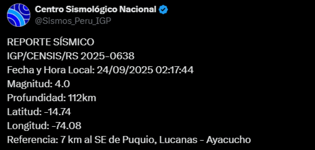 A las 02:17 a.m. de este miércoles 24 de septiembre, Ayacucho registró un sismo de magnitud 4,0. El epicentro se dio a 7 km al sur este de Puquio, Lucanas, según el Centro Sismológico Nacional.