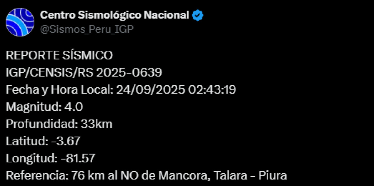 A las 02:43 a.m. de este miércoles 24 de septiembre, Piura registró un sismo de magnitud 4,0. El epicentro se dio a 76 km al noroeste de Máncora, Talara, según el Centro Sismológico Nacional.