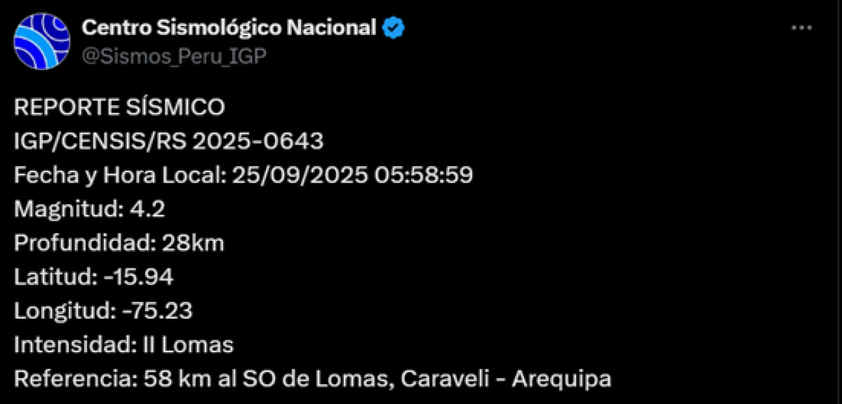 A las 05:58 a.m. de este jueves 25 de septiembre, la ciudad de Arequipa registró un sismo de magnitud 4,2. El epicentro se dio a 58 km al suroeste de Lomas, Caraveli, con una profundidad de 28 kilómetros, según el Centro Sismológico Nacional.