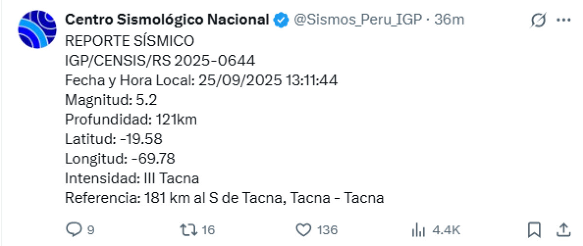 A las 13:11 p.m. de este jueves 25 de septiembre, la ciudad de Tacna registró un sismo de magnitud 5,2. El epicentro se dio a 181 km al sur de Tacna, según el Centro Sismológico Nacional.
