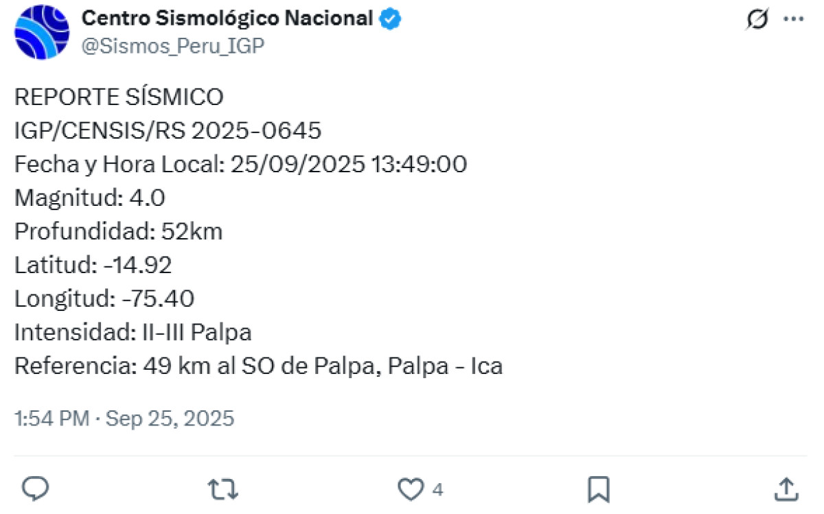 Este jueves 25 de septiembre, la ciudad de Ica registró un sismo de magnitud 4,0. El epicentro se dio a 49 km al suroeste de Palpa, según el Centro Sismológico Nacional.
