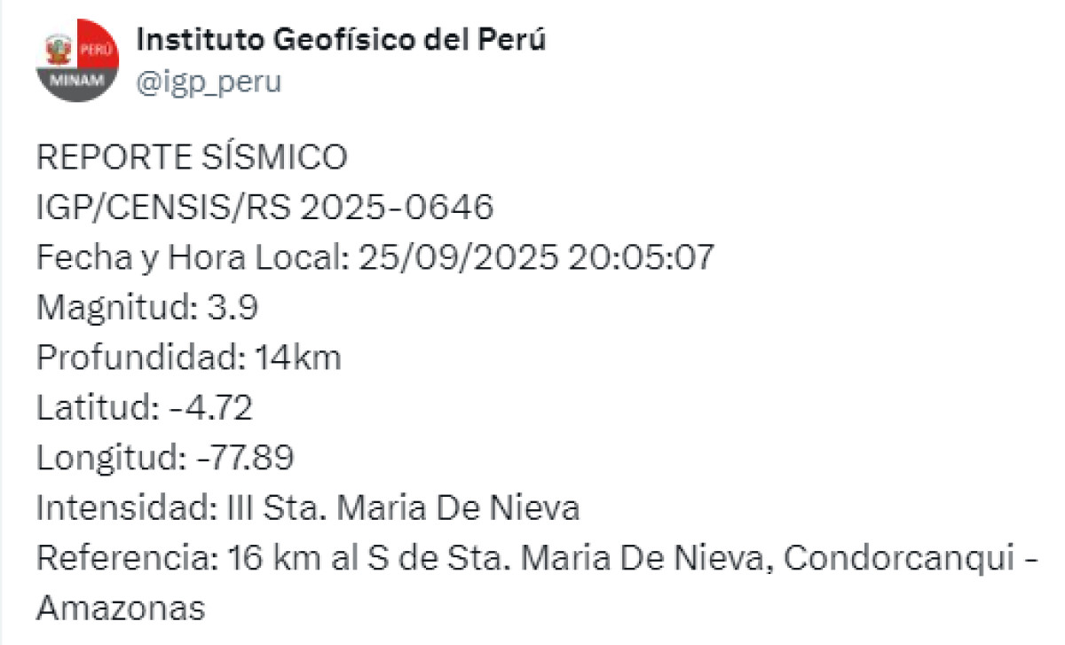 Un sismo de magnitud 3,9 se registró a las 20:05 p. m. a 16 kilómetros al sur de Maria De Nieva, Condorcanqui, Amazonas. El temblor del 25 de septiembre de 2025, se registró a una profundidad de 14 kilómetros, según informó el Instituto Geofísico del Perú (IGP) vía Twitter. Recuerda tener siempre lista una mochila de emergencia para estar preparado ante un desastre natural.