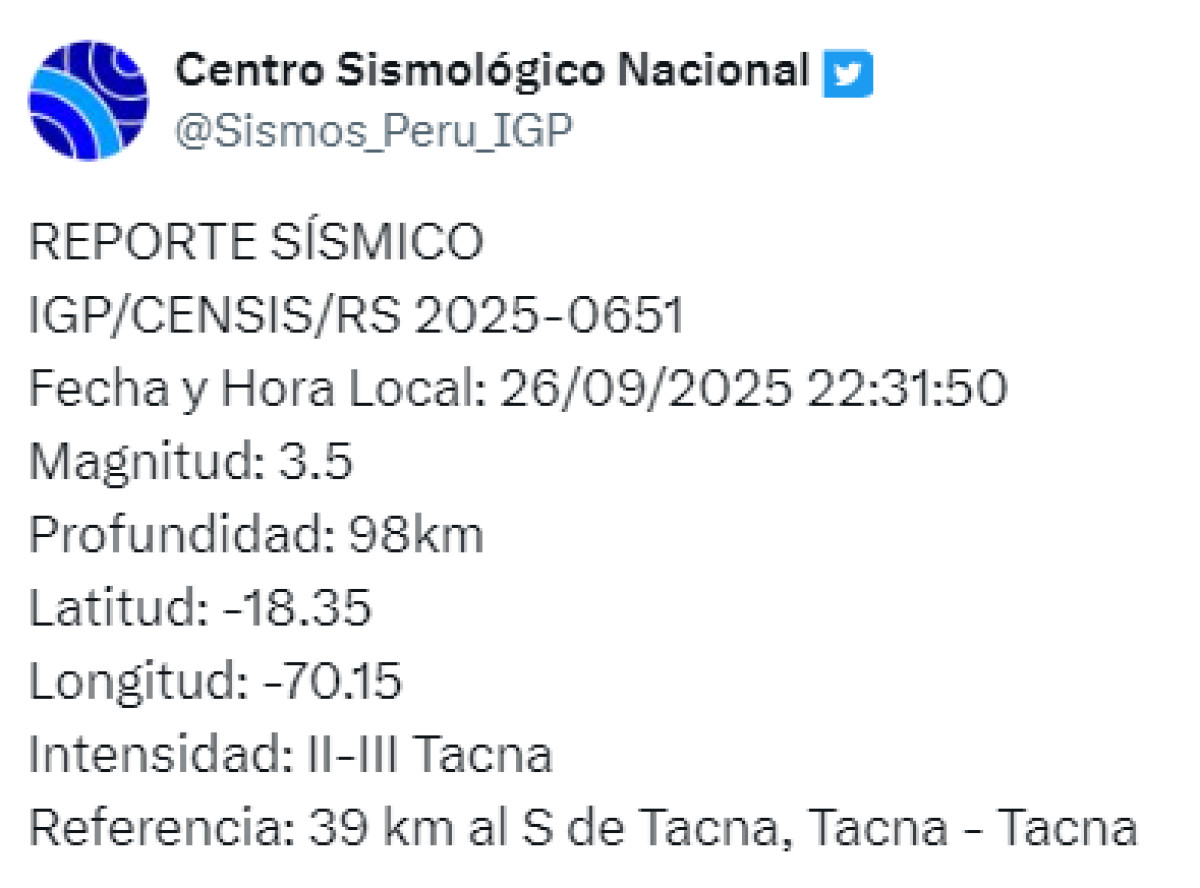 Un temblor de magnitud 3,5 se registró a las 10:31 a. m. a 39 kilómetros al sur Tacna. El temblor del 26 de septiembre de 2025, se registró a una profundidad de 98 kilómetros, según informó el Instituto Geofísico del Perú (IGP) vía Twitter. Recuerda tener siempre lista una mochila de emergencia para estar preparado ante un desastre natural.