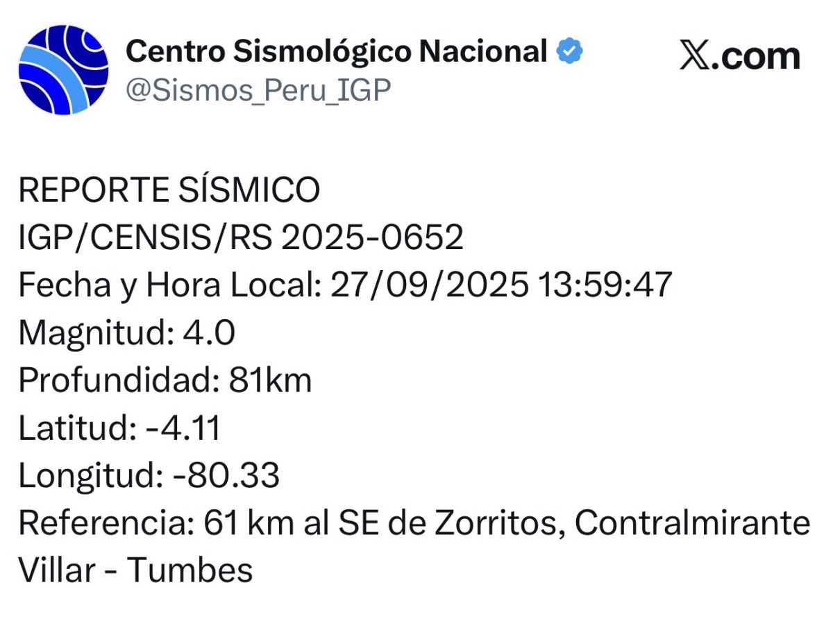 Un temblor de magnitud 4,0 se registró a las 01:59 p. m. a 61 kilómetros al sureste de Tumbes. El temblor del 27 de septiembre de 2025, se registró a una profundidad de 81 kilómetros, según informó el Instituto Geofísico del Perú (IGP) vía Twitter. Recuerda tener siempre lista una mochila de emergencia para estar preparado ante un desastre natural.