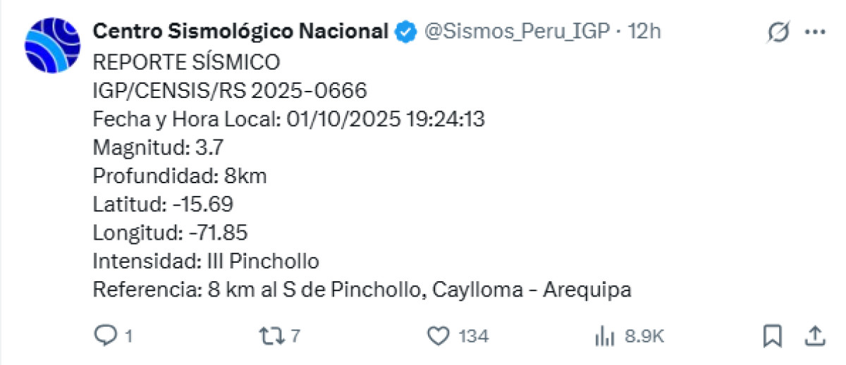 Un sismo de 3,7 de magnitud se registró en la ciudad de Arequipa, a las 7:24 p.m. del miércoles 1 de octubre. El epicentro se dio a 8 km al sur de Pinchollo, Caylloma.