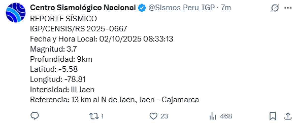 Un sismo de 3,7 de magnitud se registró en la ciudad de Cajamarca, a las 8:33 a.m. del jueves 2 de octubre. El epicentro se dio a 13 km al norte de Jaen.
