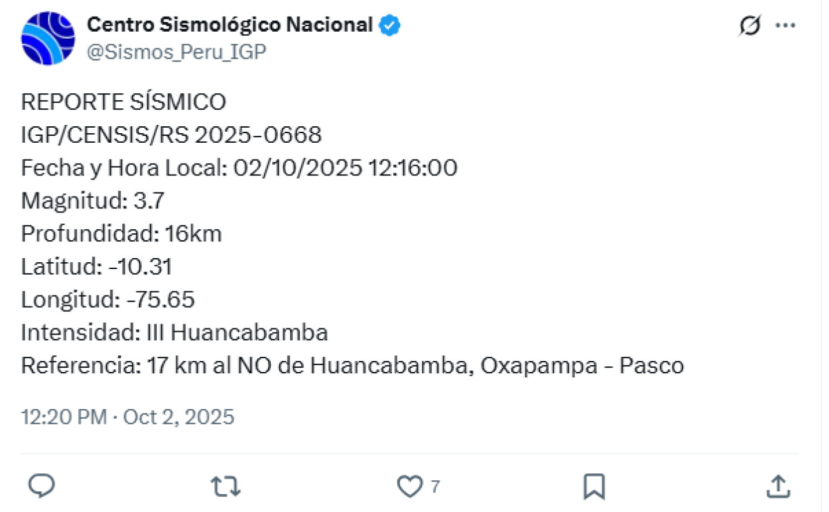 Un sismo de 3,7 de magnitud se registró en la ciudad de Pasco, a las 12:16 p.m. del jueves 2 de octubre. El epicentro se dio a 17 km al norteoeste de Huancabamba, Oxapampa.