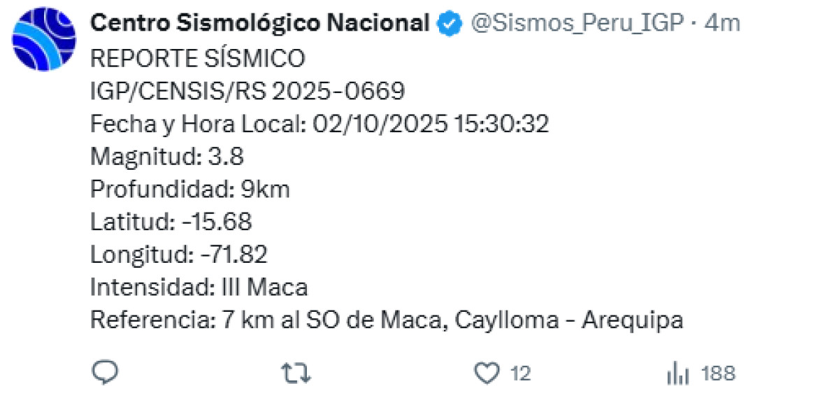 Perú vuelve a temblar. Un sismo de 3,8 de magnitud se registró en la ciudad de Arequipa, a las 12:16 p.m. del jueves 2 de octubre. El epicentro se dio a 7 km al suroeste de Maca, Caylloma.