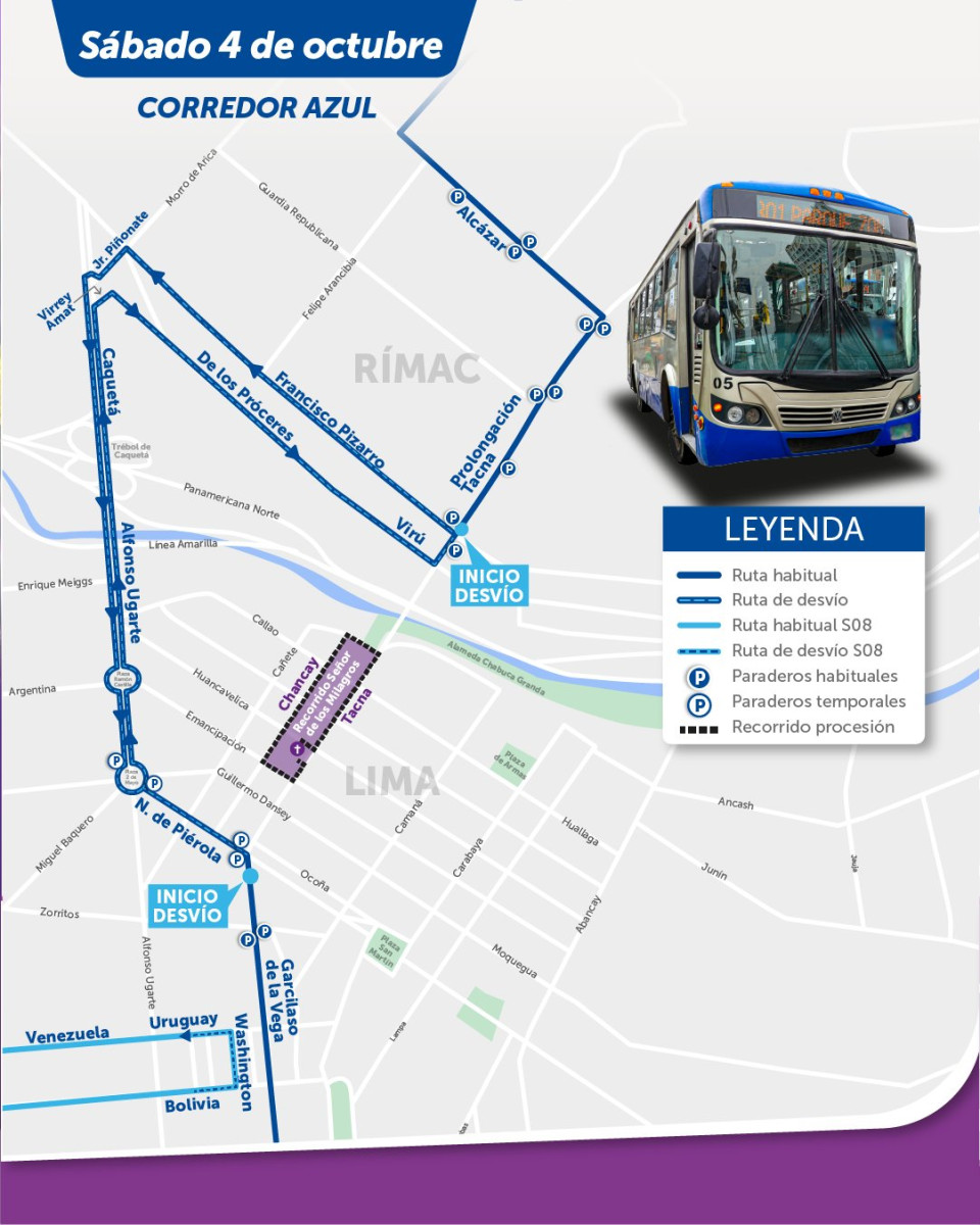 Vehículos que transiten desde la avenida Argentina llegarán hacia la Plaza Ramón Castilla y retornarán al Callao. Asimismo, los buses del Servicio Extraordinario 08 del mismo corredor Azul llegarán a Lima desde San Martín de Porrres y solo circularán hacia jirón Washigton, donde ingresarán por la Av. Bolivia para regresar ha dicho distrito por las avenidas Uruguay y Venezuela, para luego continuar por su recorrido habitual. Sobre los buses del corredor Morado, el servicio 412 llegará solo hasta el Jr. Virú, en el Rímac, e iniciará su retorno hacia San Juan de Lurigancho.