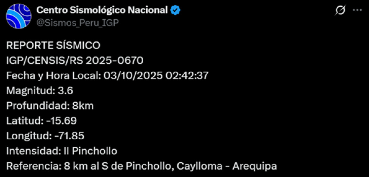A las 02:42 a.m. de este viernes 03 de octubre, la ciudad de Arequipa registró un sismo de magnitud 3,6. El epicentro se dio a 8 km al sur Pinchollo, Caylloma, con una profundidad de 8 kilómetros, según el Centro Sismológico Nacional.
