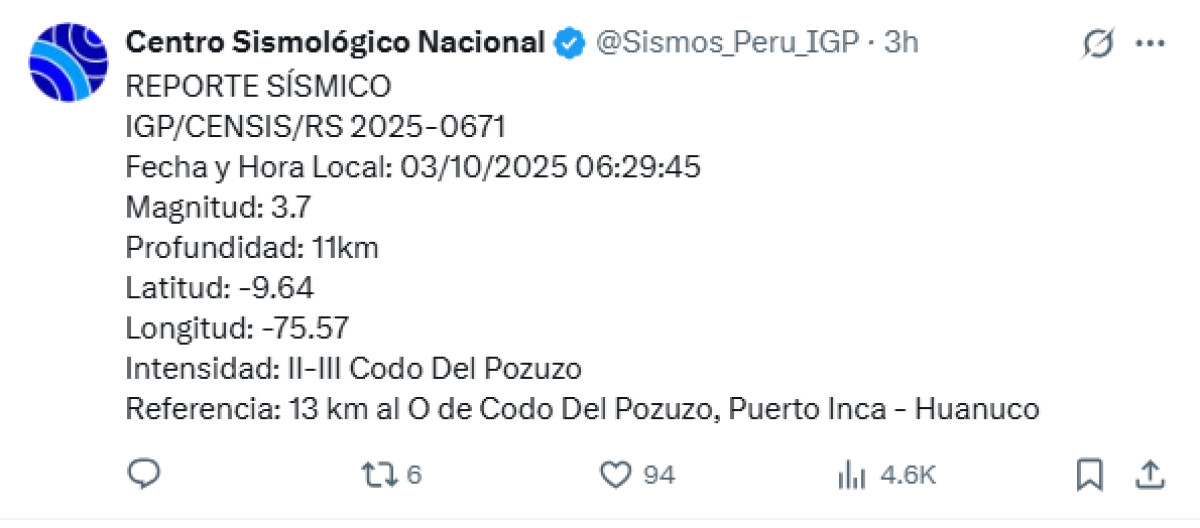 A las 06:42 a.m. de este viernes 03 de octubre, la ciudad de Huánuco registró un sismo de magnitud 3,6. El epicentro se dio a 13 km al oeste de Codo del Pozuzo, Puerto Inca, con una profundidad de 11 kilómetros, según el Centro Sismológico Nacional.