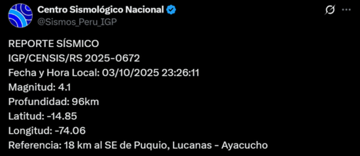 A las 23:26 p.m. de este viernes 03 de octubre, la ciudad de Ayacucho registró un sismo de magnitud 4,1. El epicentro se dio a 18 km al sureste Puquio, Lucanas, con una profundidad de 96 kilómetros, según el Centro Sismológico Nacional.