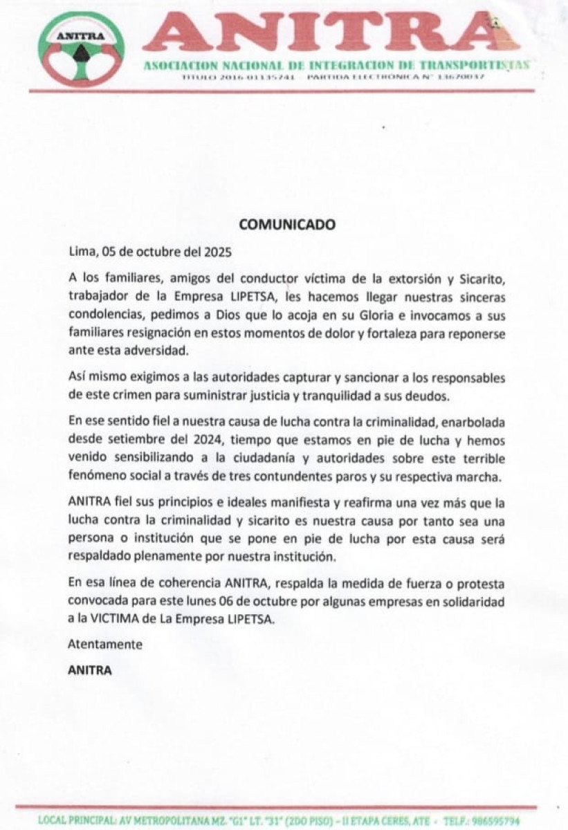 Mediante un comunicado, la Asociación Nacional de Integración de Transportistas (ANITRA) lamentó lo ocurrido el pasado sábado tras la muerte de un conductor. Aseguraron que están a favor del paro y solicitaron que las autoridades capturen y detengan a la persona implicada en este caso.