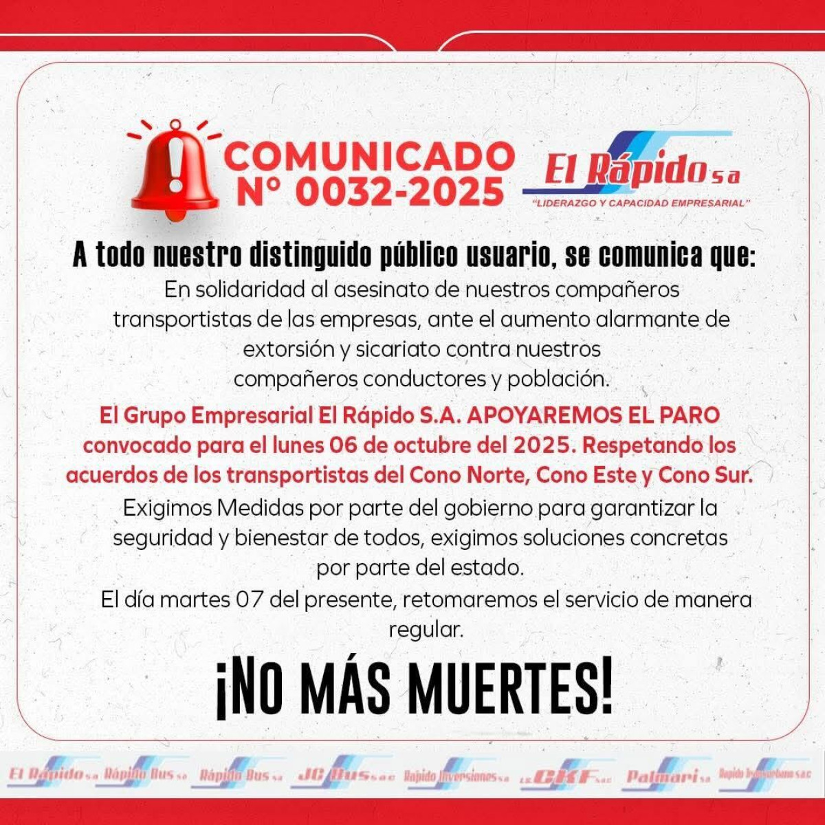 Mediante un comunicado, la empresa de transporte El Rápido, mencionó que no movilizarán sus unidades durante el paro del lunes 6 de octubre y exigieron que el gobierno tome medidas ante el aumento de extorsiones en la capital.