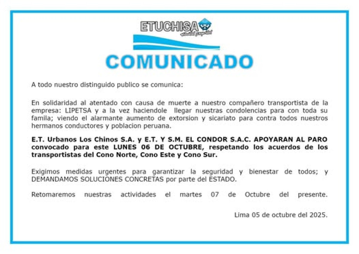 A través de un comunicado oficial la empresa de transporte Etuchisa, mejor conocida como 'Los Chinos' indicó que en señal de solidaridad por el reciente asesinato del conductor de la línea Lipetsa apoyarán el paro hoy lunes 6 de octubre. En el mismo aviso dan a conocer que la empresa El Cóndor S.A.C se unirá también a la medida, además de que estarán retormando actividades el martes 7.