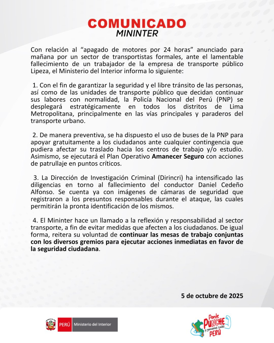 El Ministerio del Interior informó por medio de un comunicado en sus redes sociales, que la Policía Nacional del Perú (PNP) se desplegará en las vías principales y paraderos de todos los distritos de Lima Metropolitana con la finalidad de garantizar la seguridad durante el paro de transporte del 6 de octubre. Además, de que aplicarán el Plan Operativo Amanecer Seguro de patrullaje en zonas críticas, entre otras medidas.