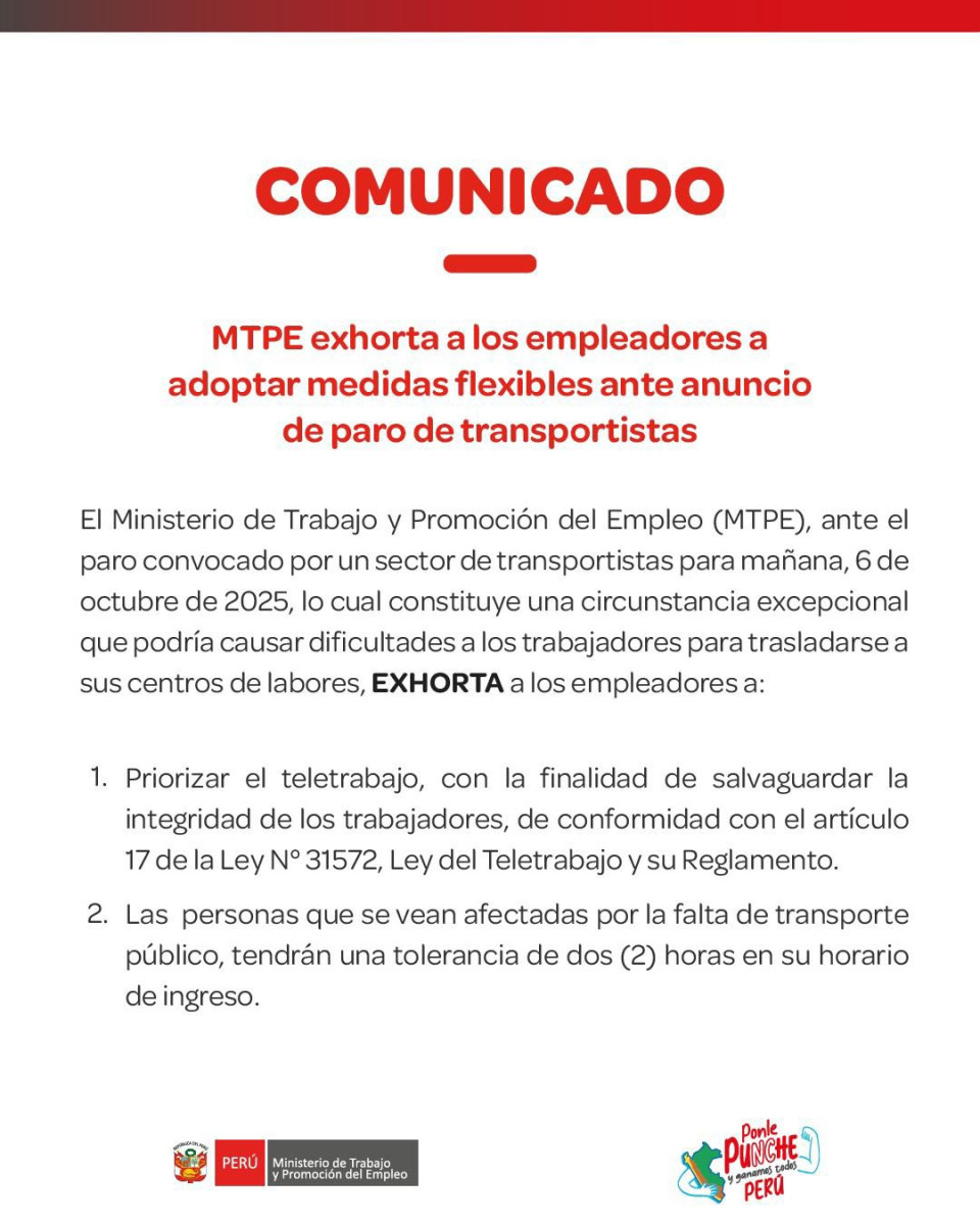 Ante el paro de transportistas del lunes 6 de octubre, el Ministerio de Trabajo y Promoción del Empleo (MTPE) exhortó a los empleadores priorizar el trabajo remoto para sus trabajadores con la finalidad de salvaguardar la seguridad conforme al artículo 17 de la Ley N° 31572. En esa misma línea, estableció dos horas de tolerancia en el horario de ingreso a quienes laboren de manera presencial y tengan problemas para transportarse.