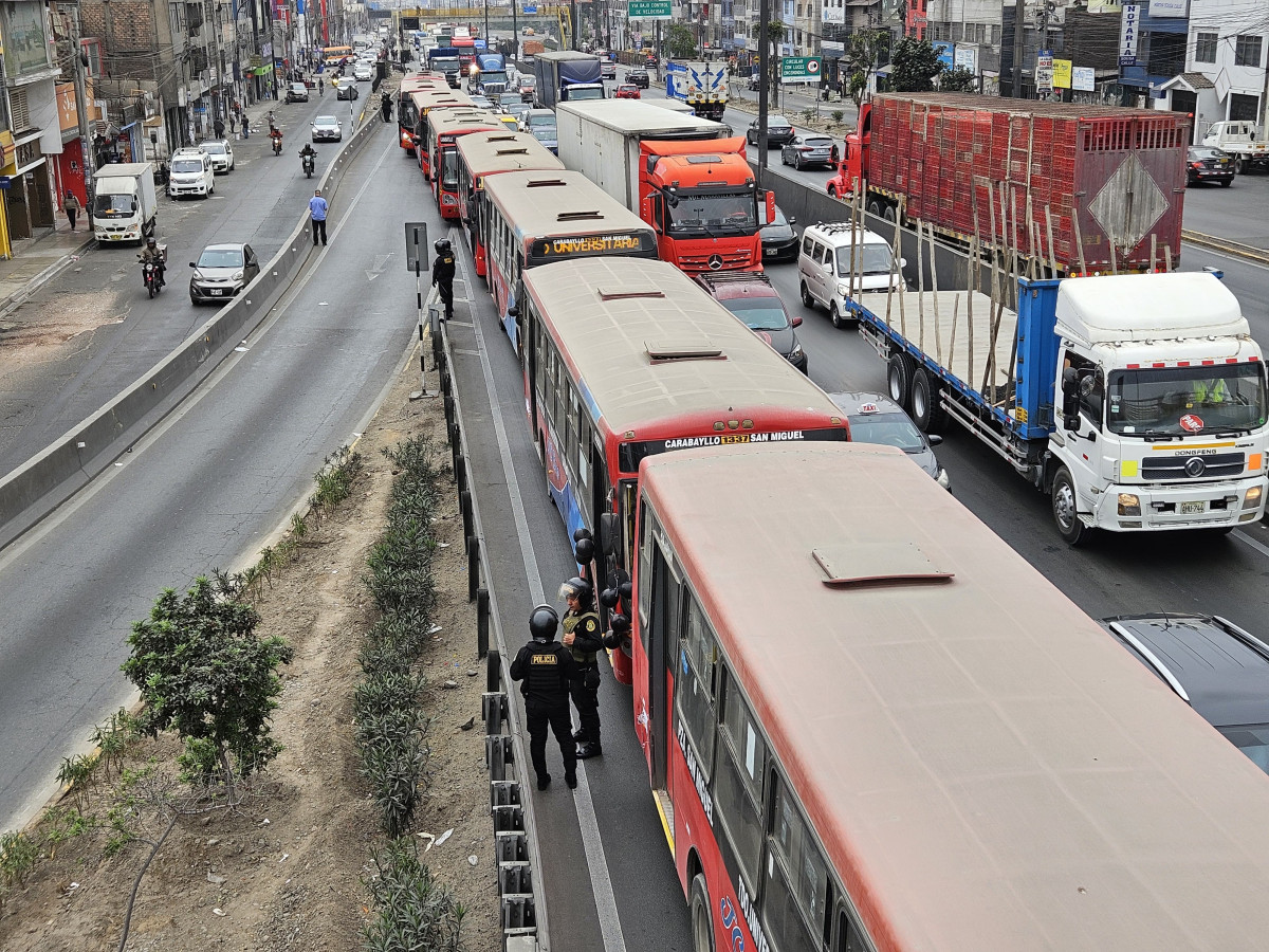 Un grupo de transportistas permanece detenido desde hace casi dos horas en el puente Control, en la Panamericana Norte, acompañado por un fuerte resguardo policial. Sin embargo, no pueden avanzar debido a que buses de las empresas Consorcio y Loritos bloquean el paso, lo que ha generado una larga fila de vehículos de carga pesada y autos particulares que se extiende hasta el óvalo de Habich.