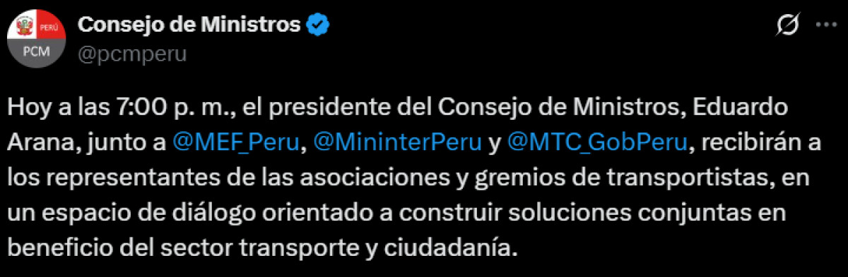 Durante la reunión con los gremios de transportistas, el Presidente del Consejo de Ministros indicó que hubo negociaciones, y que se llegó al acuerdo de que no se seguirá con el paro este 7 de octubre.