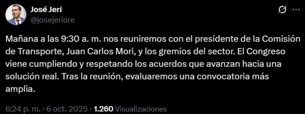 Tras el anuncio del gremio, el presidente del Congreso, José Jeri, informó a través de su cuenta X que se reunirá con los representantes del transporte este martes 7 de octubre a las 9:30 a. m.. Por su parte, el presidente de la Comisión de Transportes, Juan Carlos Mori, envió un oficio a la presidenta Dina Boluarte solicitando que se declare en emergencia el transporte urbano en Lima debido a la ola de extorsiones que afecta al sector.