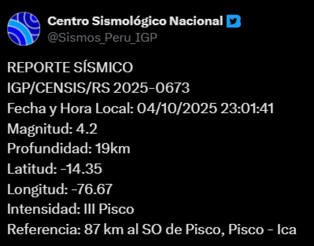 Un temblor de magnitud 4,2 se registró ayer a las 11:01 p. m. a 87 kilómetros al suroeste de Pisco, Ica. El temblor del 4 de octubre de 2025, se registró a una profundidad de 19 kilómetros, según informó el Instituto Geofísico del Perú (IGP) vía Twitter. Recuerda tener siempre lista una mochila de emergencia para estar preparado ante un desastre natural.