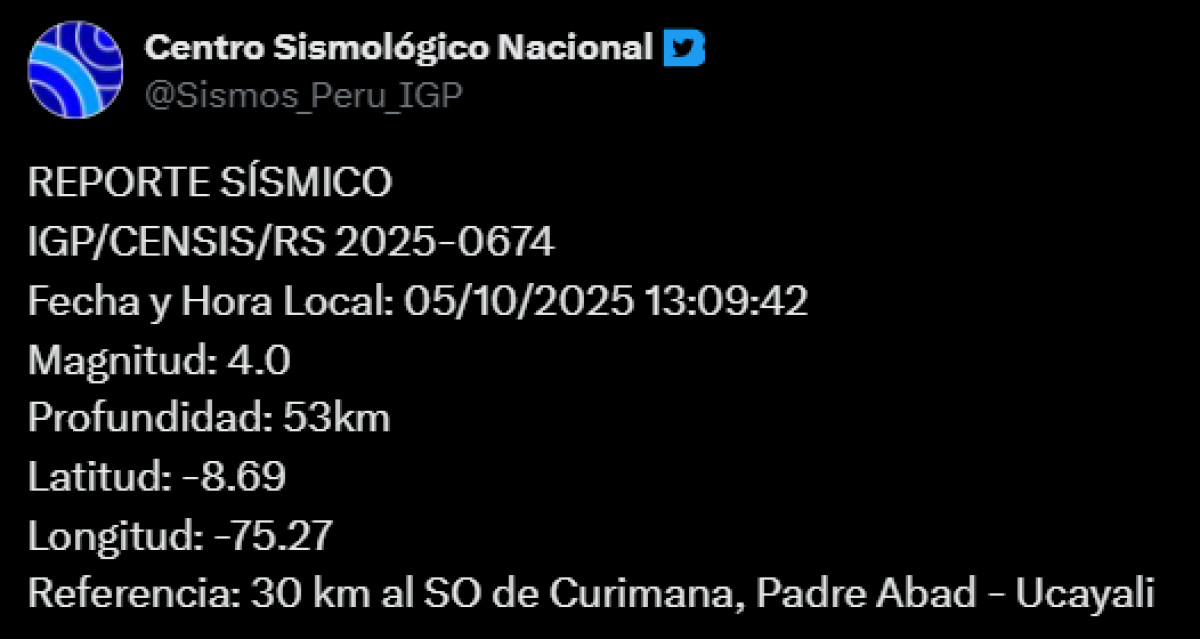 Un temblor de magnitud 4,0 se registró a las 01:24 p. m. a 30 kilómetros al suroeste de Curimana, Ucayali. El temblor del 5 de octubre de 2025, se registró a una profundidad de 22 kilómetros, según informó el Instituto Geofísico del Perú (IGP) vía Twitter. Recuerda tener siempre lista una mochila de emergencia para estar preparado ante un desastre natural.