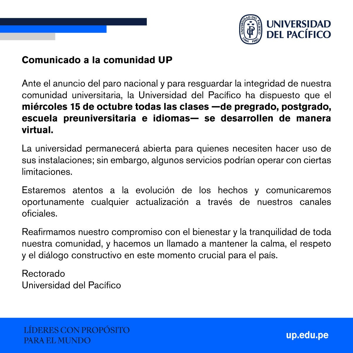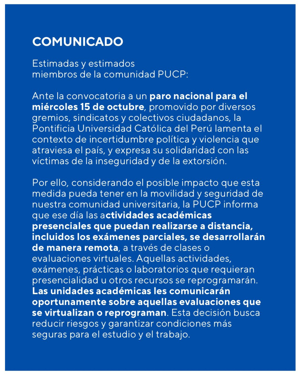 La Pontificia Universidad Católica del Perú (PUCP) informó que, debido al paro nacional del miércoles 15 de octubre, todas sus actividades académicas presenciales se desarrollarán de manera virtual, incluidos los exámenes parciales programados para esa fecha. Asimismo, las sesiones que requieran el uso de laboratorios o prácticas presenciales serán reprogramadas por cada facultad.