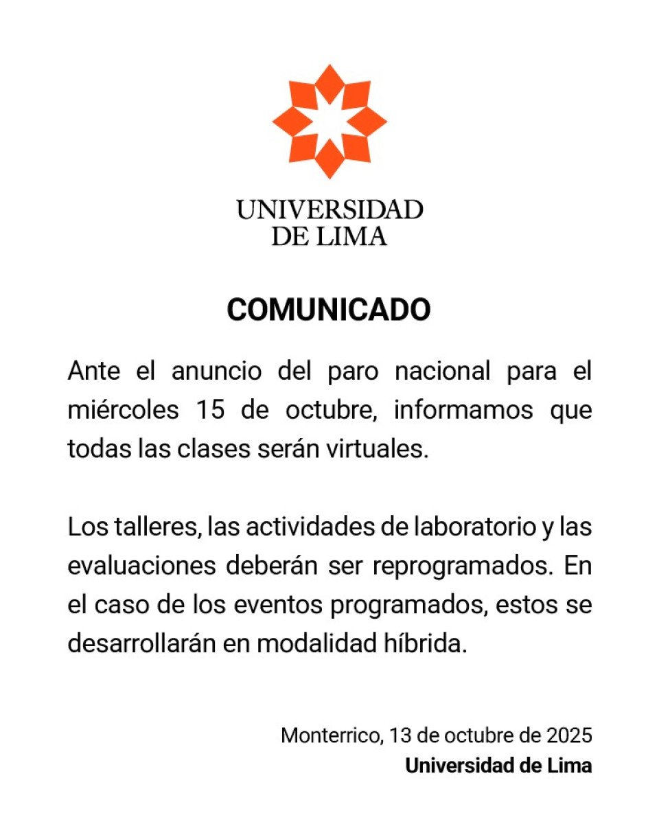 La Universidad de Lima anunció que este miércoles 15 de octubre las clases se desarrollarán de forma virtual debido al paro nacional convocado para esa fecha. Los talleres, actividades de laboratorio y exámenes presenciales serán reprogramados por cada facultad.