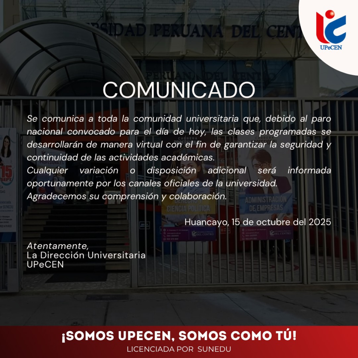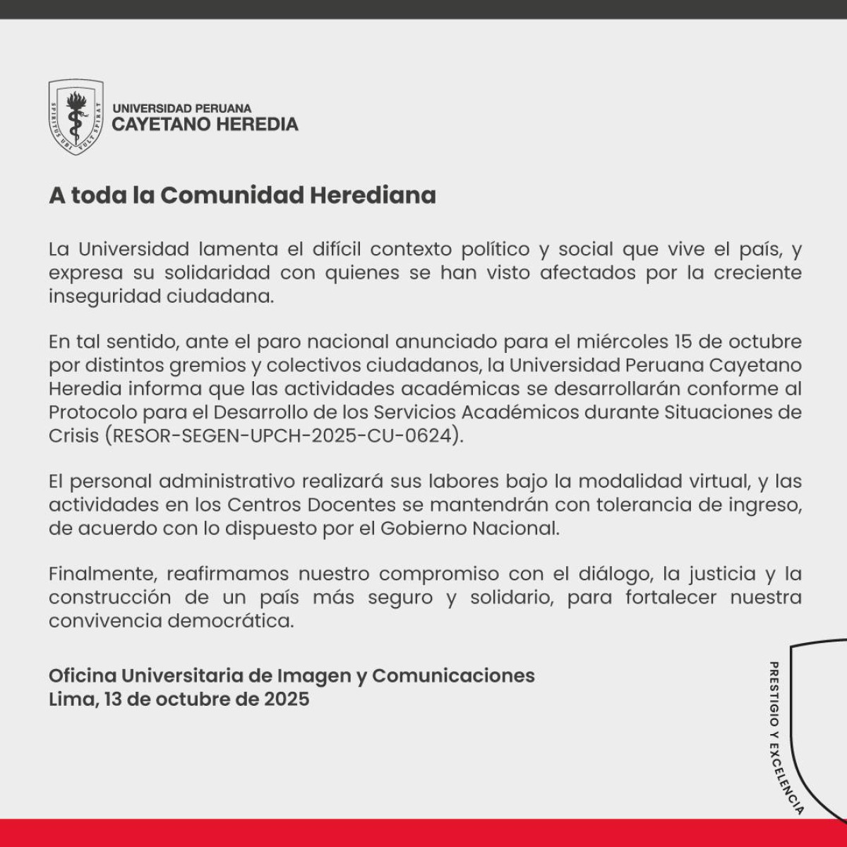 La Universidad Peruana Cayetano Heredia (UPCH) informó que, ante la convocatoria del paro nacional del 15 de octubre, las clases se desarrollarán de manera remota. Asimismo, el personal administrativo realizará sus labores de forma virtual durante esa jornada.