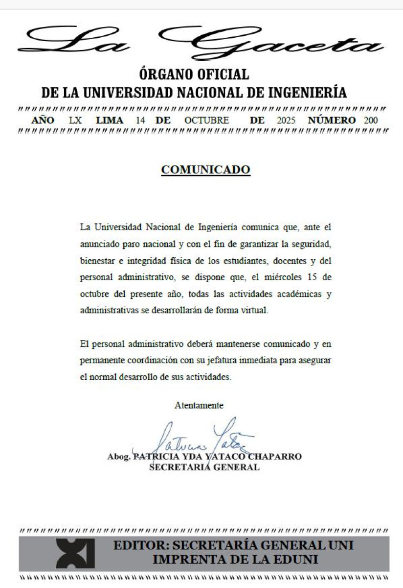 -Universidad Nacional de Ingeniería: UNI informó que el miércoles 15 de octubre todas las actividades académicas y administrativas se realizarán de manera virtual.