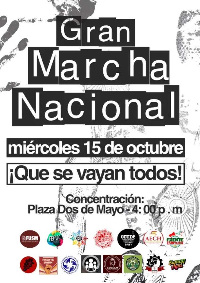 Este 15 de octubre se llevará a cabo una nueva jornada de protestas a nivel nacional a la que se sumarán diversos grupos. Entre ellos figuran el bloque interuniversitario, sindicatos del transporte, comerciantes de Gamarra, docentes, entre otros. Además, colectivos de distintas regiones como Puno, Piura y La Libertad han confirmado su adhesión a esta medida de lucha prevista para el miércoles.