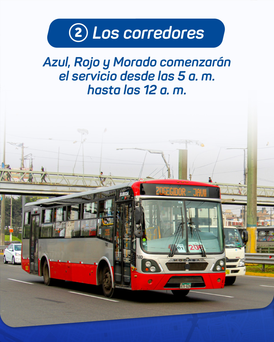 - Corredores Complementarios: Todos los servicios operarán desde las 5 a. m. hasta las 12 a. m.