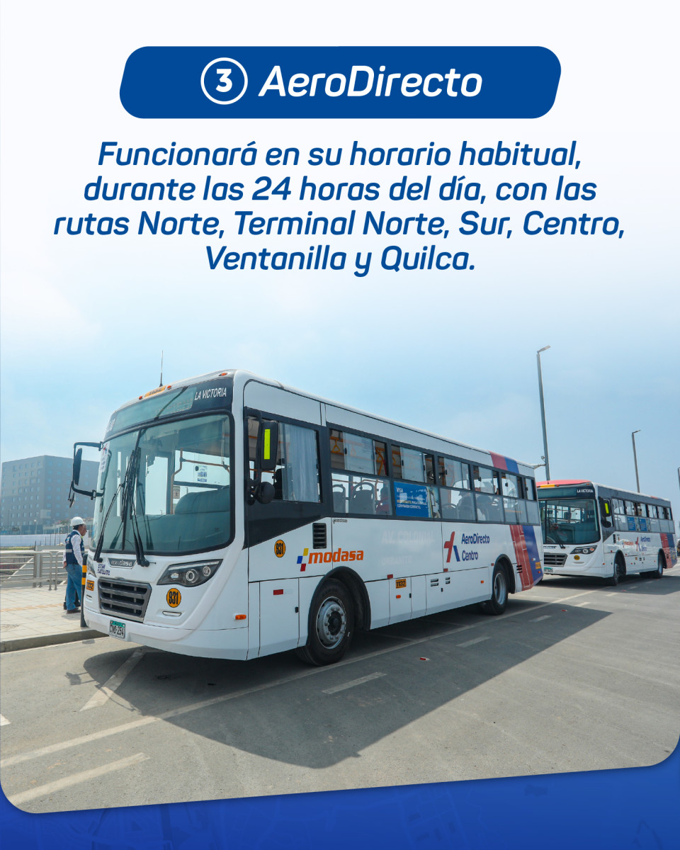 - AeroDirecto: Funcionará en su horario habitual durante las 24 horas del día con las rutas Norte, Terminal Norte, Sur, Centro, Ventanilla y Quilca.