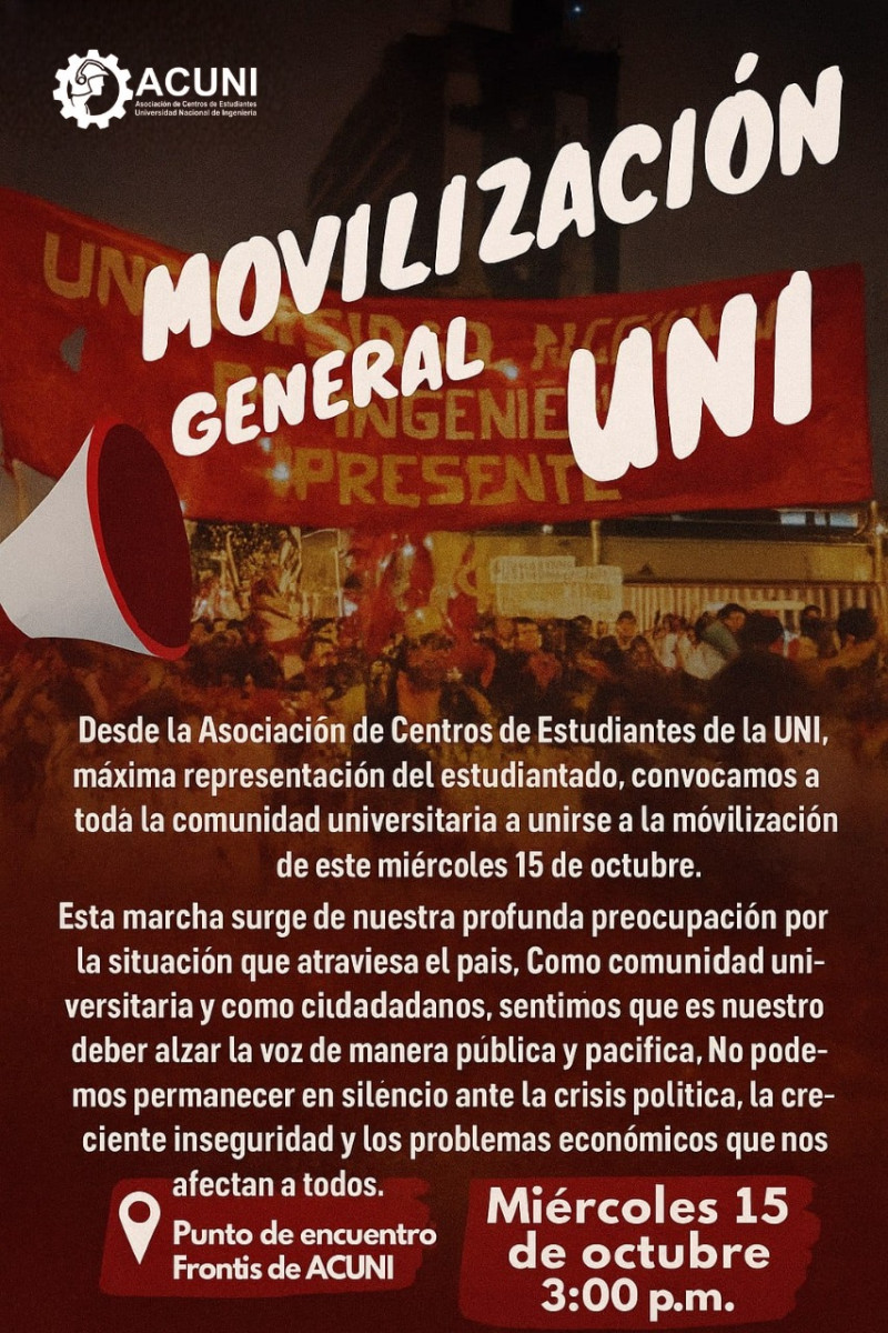 El paro nacional del miércoles 15 de octubre iniciará desde las 8:00 a. m. con movilizaciones en distintos puntos de Lima y Callao. En Gamarra, la concentración comenzará en el parque Cánepa a esa hora, mientras que los universitarios de San Marcos y la UNI realizarán preconcentraciones desde las 2:00 p. m. y 3:00 p. m., respectivamente, para marchar hacia la Plaza Dos de Mayo, donde se espera la concentración principal desde las 4:00 p. m..
