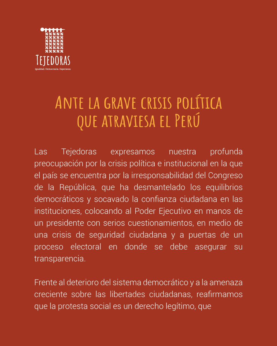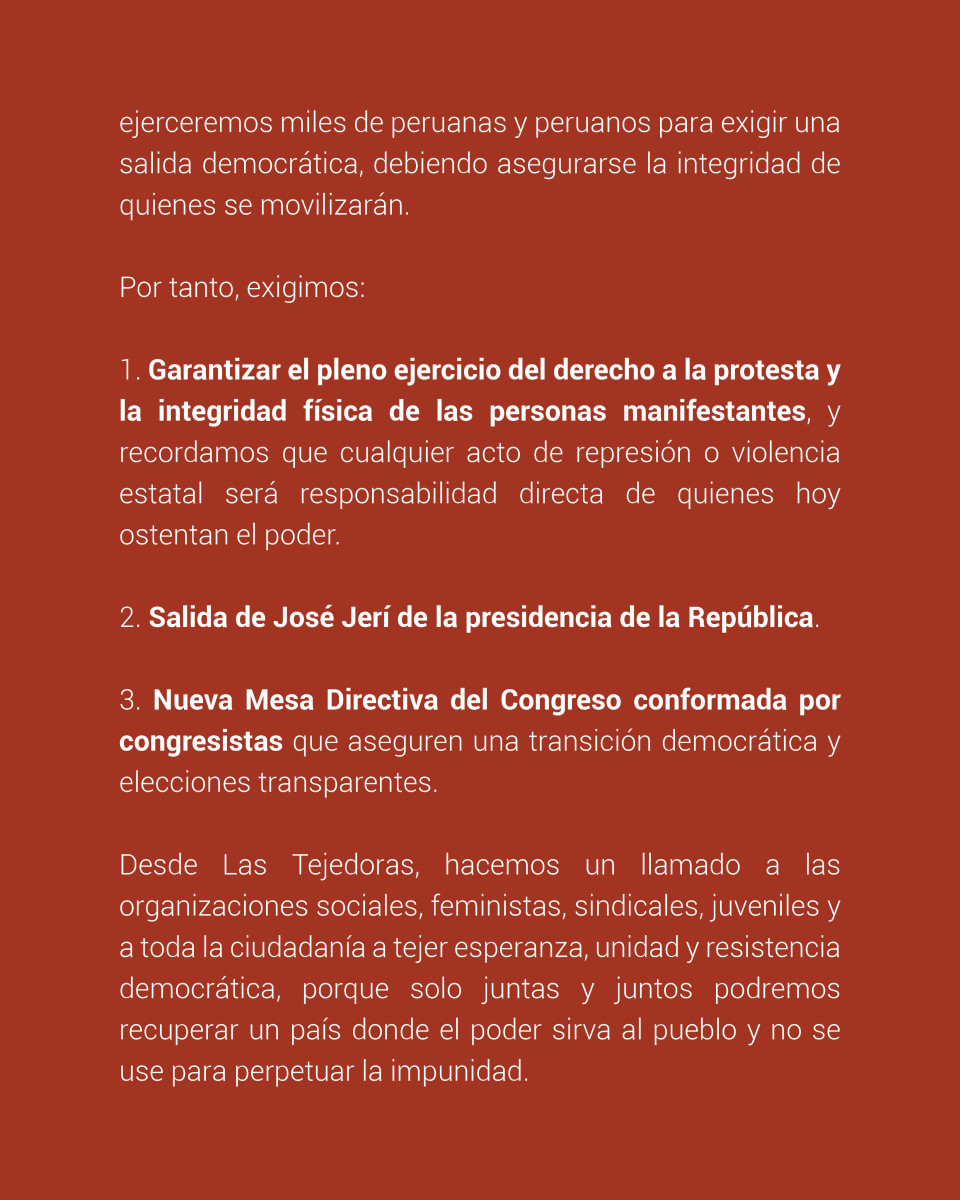Tras la vacancia de Dina Boluarte, diversos colectivos confirmaron su participación en las movilizaciones de este 15 de octubre. Estos están conformados por: