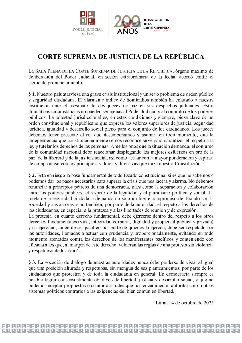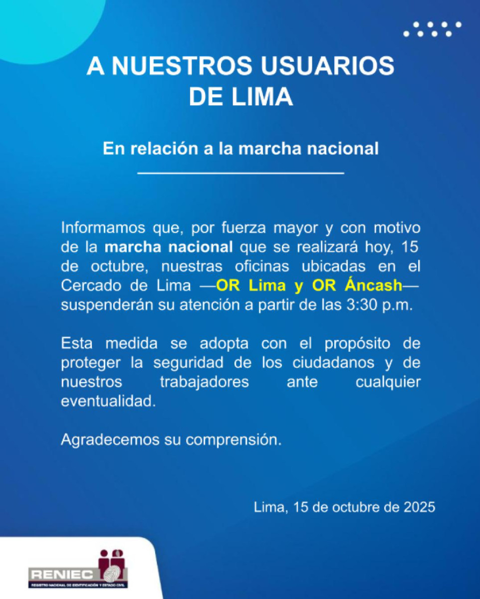 Tras la marcha nacional convocada el miércoles 15 de octubre, en la que participaron docentes, jóvenes universitarios, transportistas y comerciantes como parte del paro nacional realizado en Lima y varias regiones, se registraron graves hechos de violencia. En el Centro Histórico de Lima, el joven Eduardo Ruiz perdió la vida tras recibir un impacto de bala, mientras que Luis Reyes Rodríguez permanece en estado de coma debido a una fractura cerebral ocasionada durante la represión policial. Además, se reportaron múltiples heridos entre manifestantes y agentes del orden. Ante estos hechos, diversos colectivos vinculados a la Generación Z convocaron nuevos plantones y concentraciones para este jueves 16 de octubre, con el fin de retomar las marchas contra el Ejecutivo y el Legislativo.