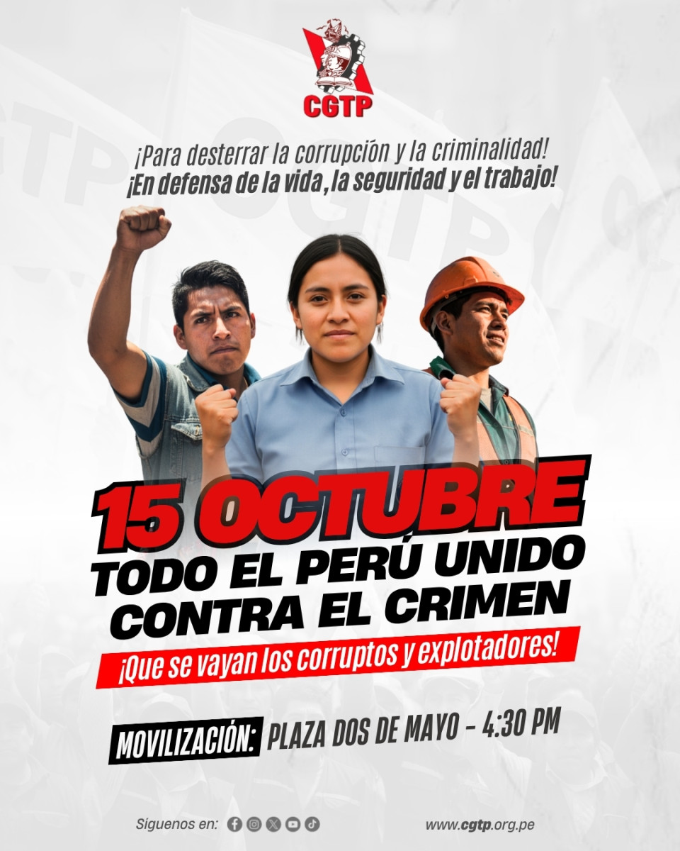 Los gremios y colectivos que impulsan el paro nacional del 15 de octubre exigen acciones inmediatas contra la inseguridad ciudadana, el sicariato y la extorsión, problemas que se han agudizado en Lima y Callao. Además, denuncian la corrupción política y la falta de resultados concretos del Gobierno y el Congreso frente a la crisis social y económica.