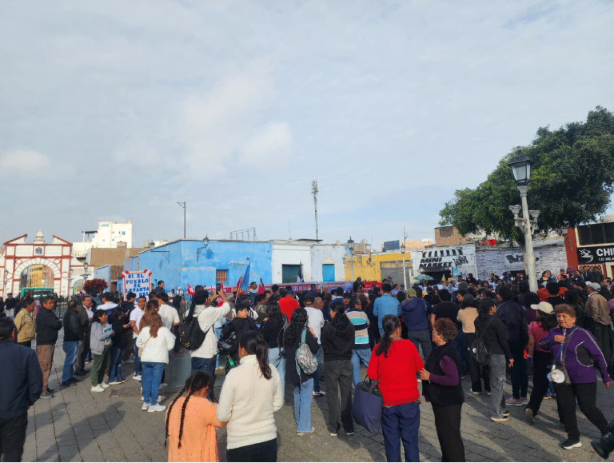 En Trujillo, un grupo de manifestantes se reúne en la Plazuela Recreo para participar en las protestas programadas por la convocada marcha nacional del 15 de octubre.