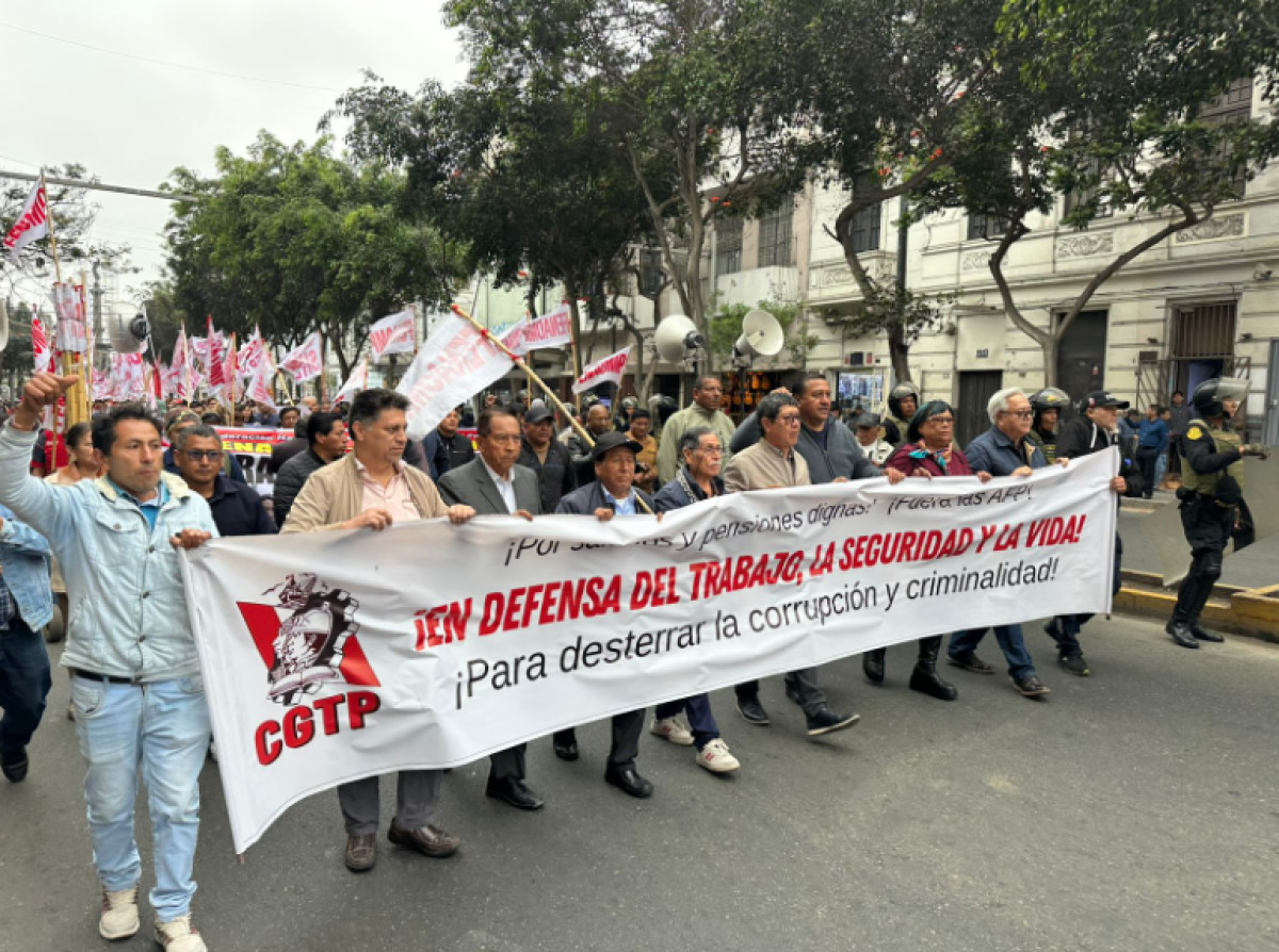 La Confederación General de Trabajadores del Perú (CGTP) avanza hacia la Plaza San Martín, siendo custodiada por la PNP durante su movilización.