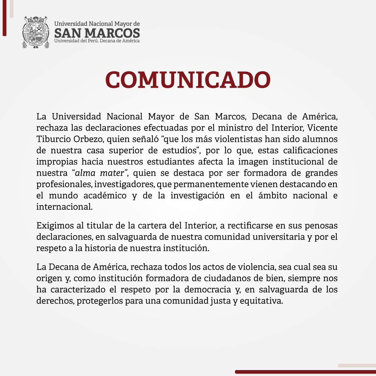 La Universidad Nacional Mayor de San Marcos (UNMSM) emitió un comunicado rechazando las declaraciones del ministro del Interior, Vicente Tiburcio Orbezo, quien calificó a los estudiantes de la decana de América como “los más violentistas”.